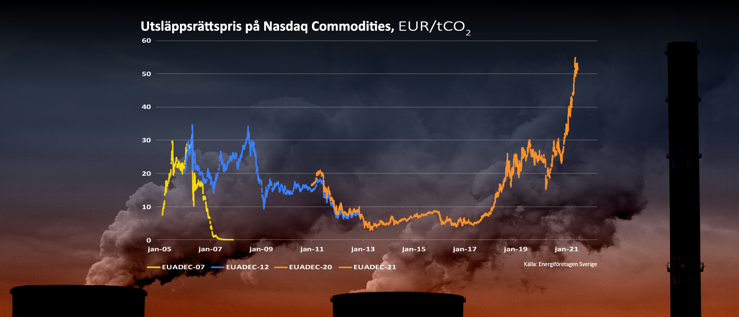 För att sätta de senaste månadernas prisutveckling i perspektiv ska man ha i åtanke att utsläppsrätterna under de 15 första åren från 2005 bara handlades över 30 euro per ton vid tre tillfällen och då endast några få dagar innan priset åter sjönk tillbaka. Det är alltså ett paradigmskifte som vi är inne i och frågan som många ställer sig är förstås hur högt priset på utsläppsrätter ska gå.