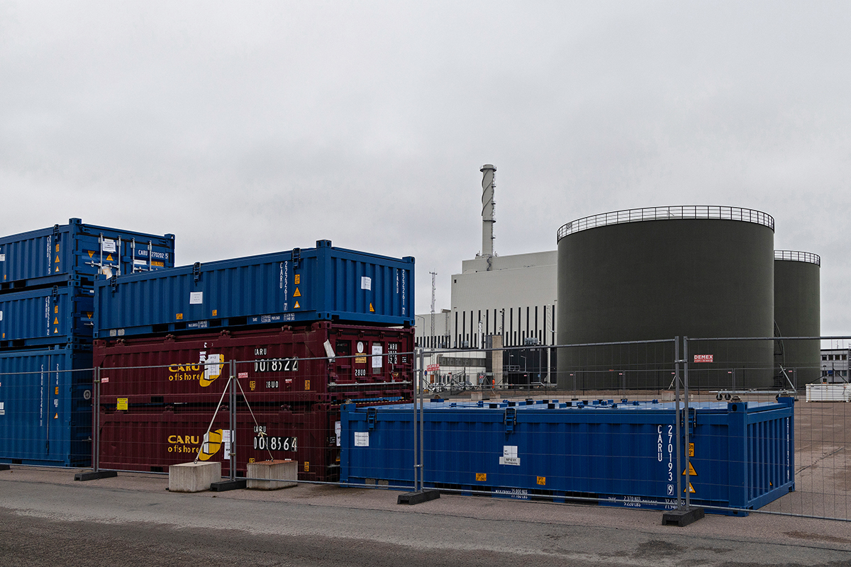 – Här nedanför ser vi några av de containrar som används till nedmonterat material och avfall från O1 och O2, och bakom murarna står containrar med mer kontaminerat avfall, säger Fredrik Björklund och pekar därefter på fartyget Sigrid i OKG:s hamn.
