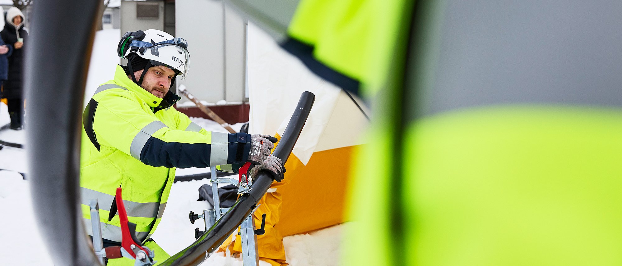 Det är förmiddag med en stigande sol som börjar dämpa vinterkylan. Nu kör vi, hörs från fikarummen intill, och gruppen civilpliktiga kabelmontörer gör sig redo för ännu ett utomhuspass.