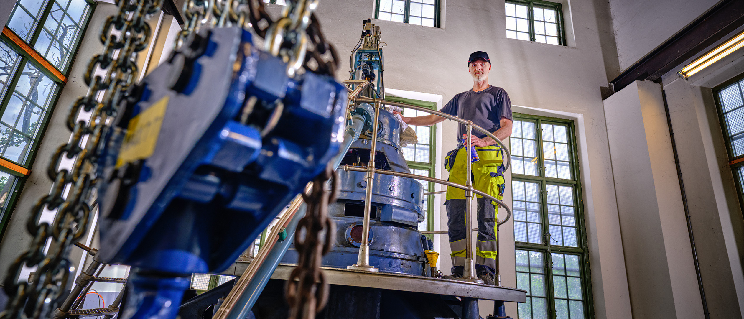 Dags att titta till turbinen. Floda vattenkraftverk går nästan helt på automatik, men två gånger i veckan får anläggningen besök av Tommy Markusson som ser till att allt fungerar som det ska. Ibland går saker sönder, och särskilt framåt hösten brukar det behövas många extrautryckningar för att städa bort löv och skräp från intagsgallret.